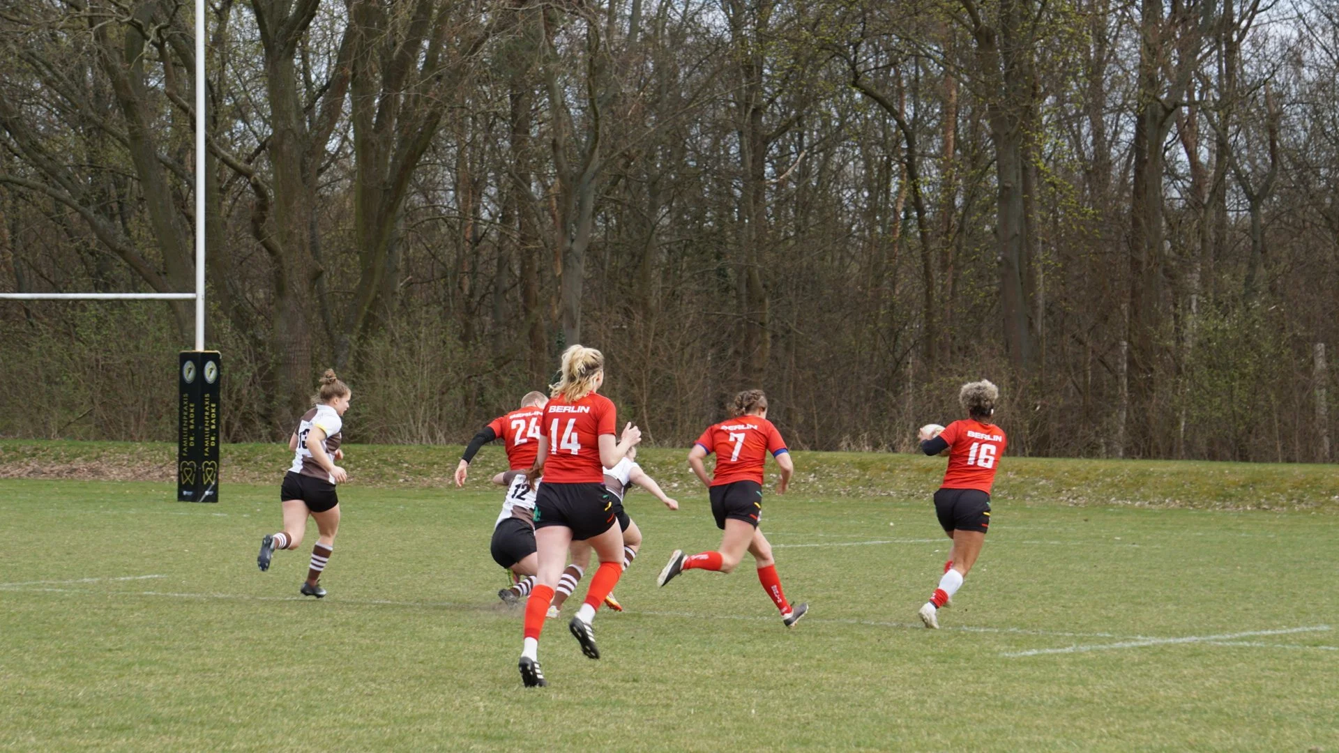 Berlin rallied, and keeping ball in hand started to make some progress, and moving from wing to wing stretched apart the home defence. Von Knoblauch opened up the midfield and from the next phase debutant Knorren-Nichols was free up the right wing, but the pass to her didnt quite go to hand in the opposition 22 and the half ended without any points for Berlin.